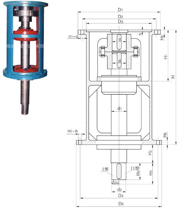 | 機(jī)架型號 | 減速機(jī) | D1 | D2 | D3 | n1-φ | D4 | D5 | n2-φ | d | d1 | d2 | h | H | H1 | H2 | H3 | H4 | H5 | H6 |